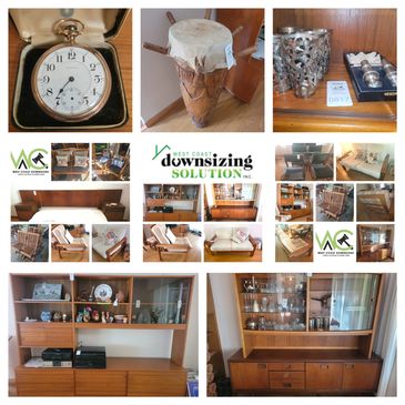 Mid Century Modern Furniture c1960's Teak Cabinets, Table, Sideboard, Sofa & Chair. Birks Sterling Silver S&P Set,